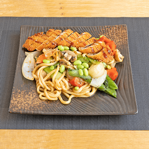 gebratene japanische Weizennudeln mit Kräuterseitlingen, Pak- Choi in Teriyakisauce und einer Zutat Ihrer Wahl